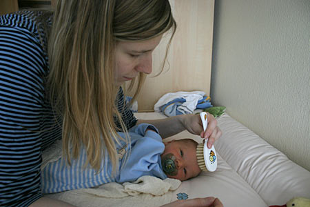 Nach 3 Tagen im Krankenhaus kam Hendrik mit Mama nach Hause. Dort wurde gleich das neue Bett getestet in dem schon zwei neue Freunde auf ihn warteten.